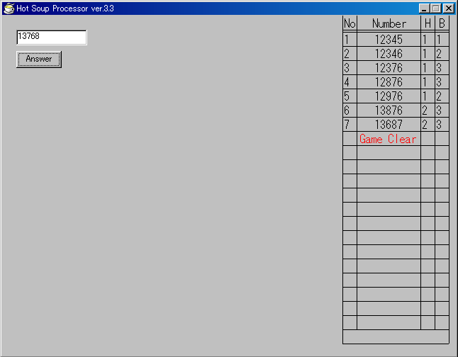 画面左に、答えた数字と、Hit・Blowの数が表示されています。